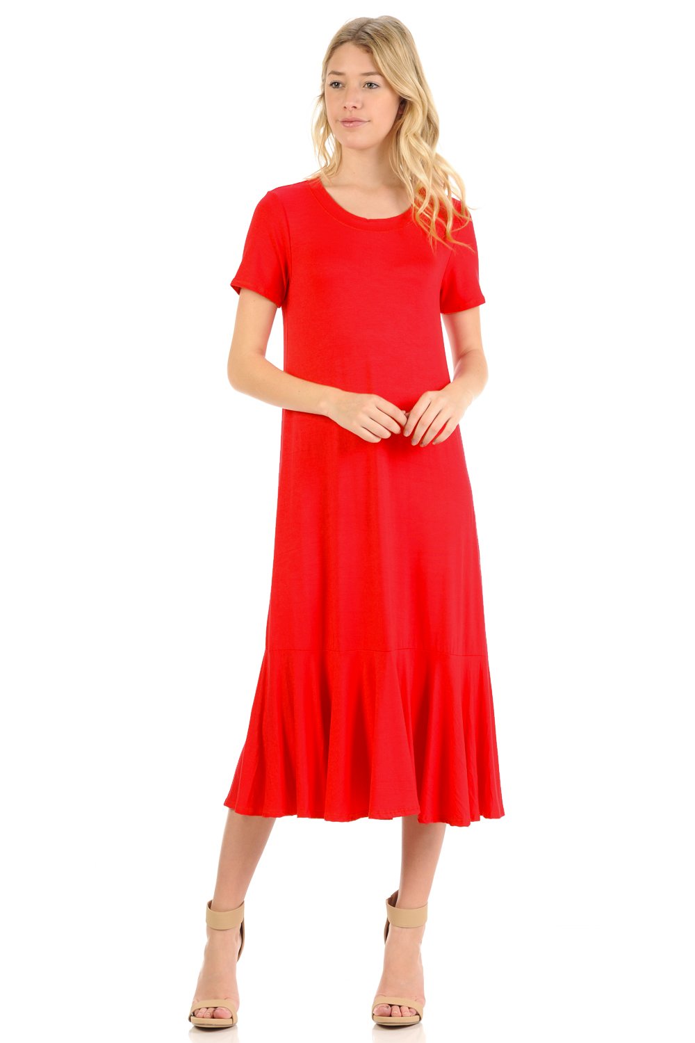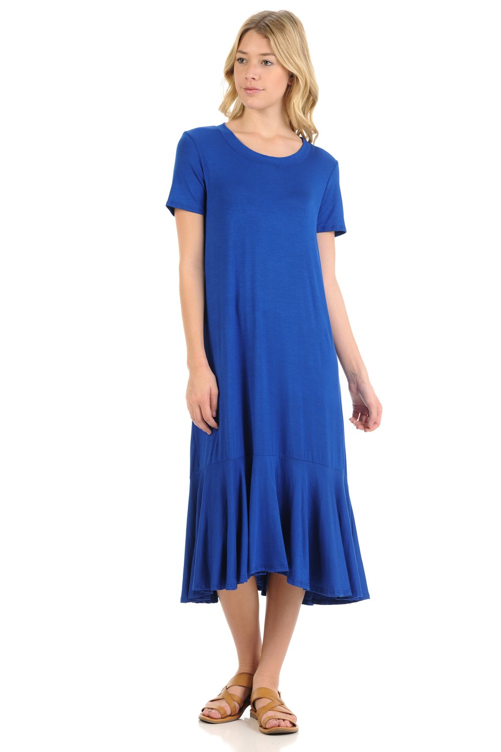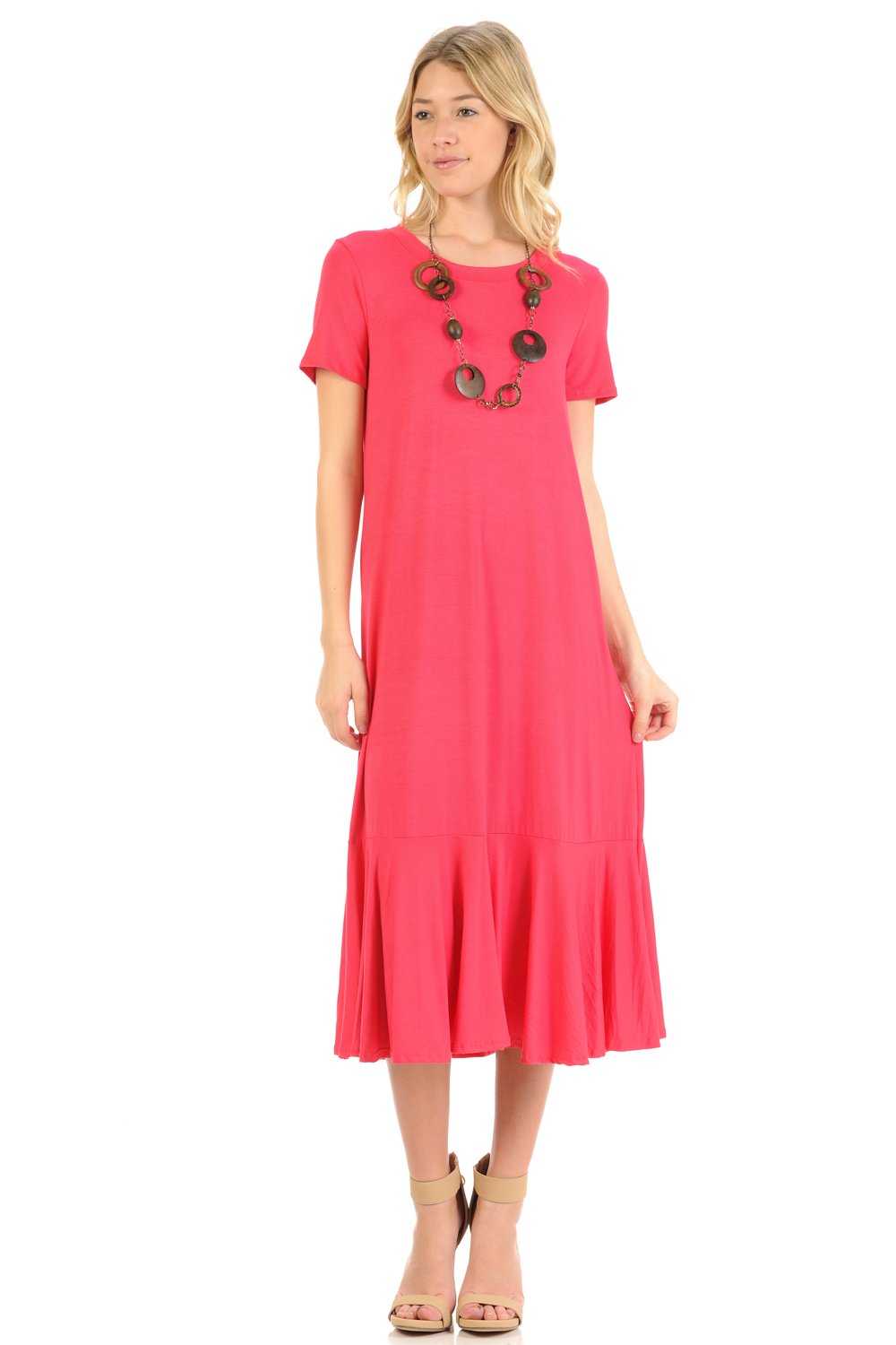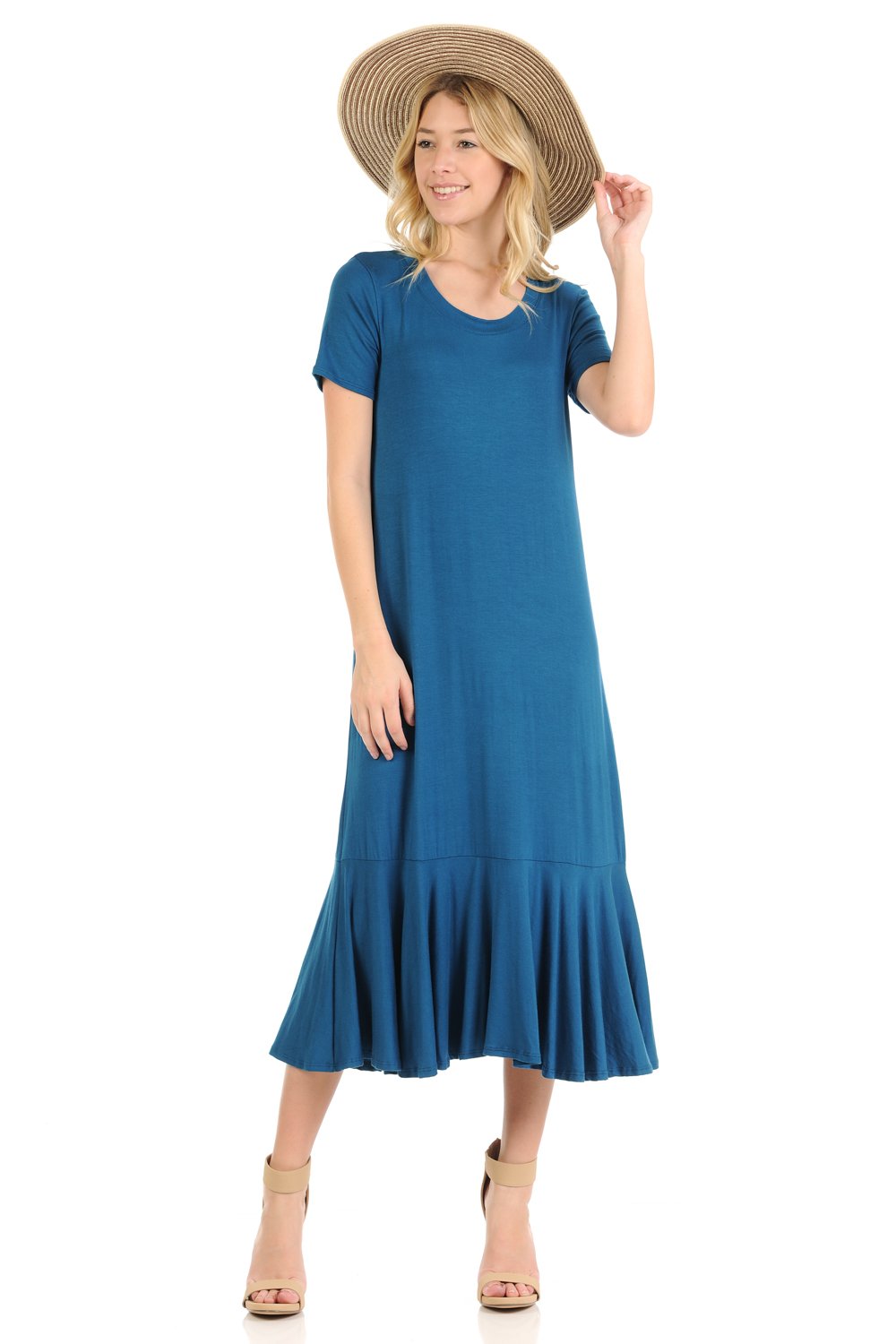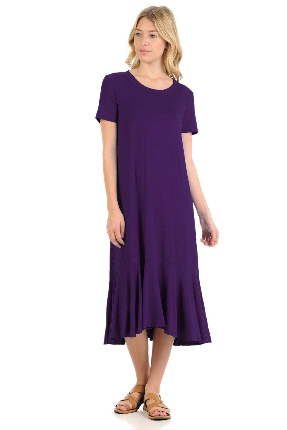 - This carefree dress features short sleeves, round neck, figure flattering A-line silhouette and ruffle hemline. It is made of soft jersey knit that has great drape.