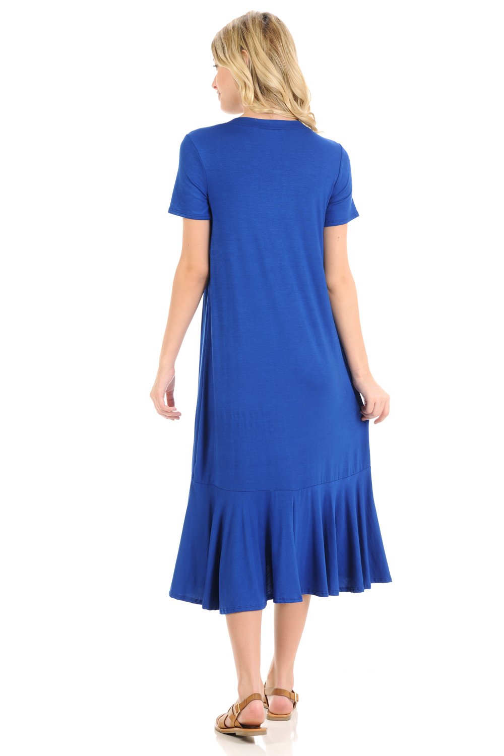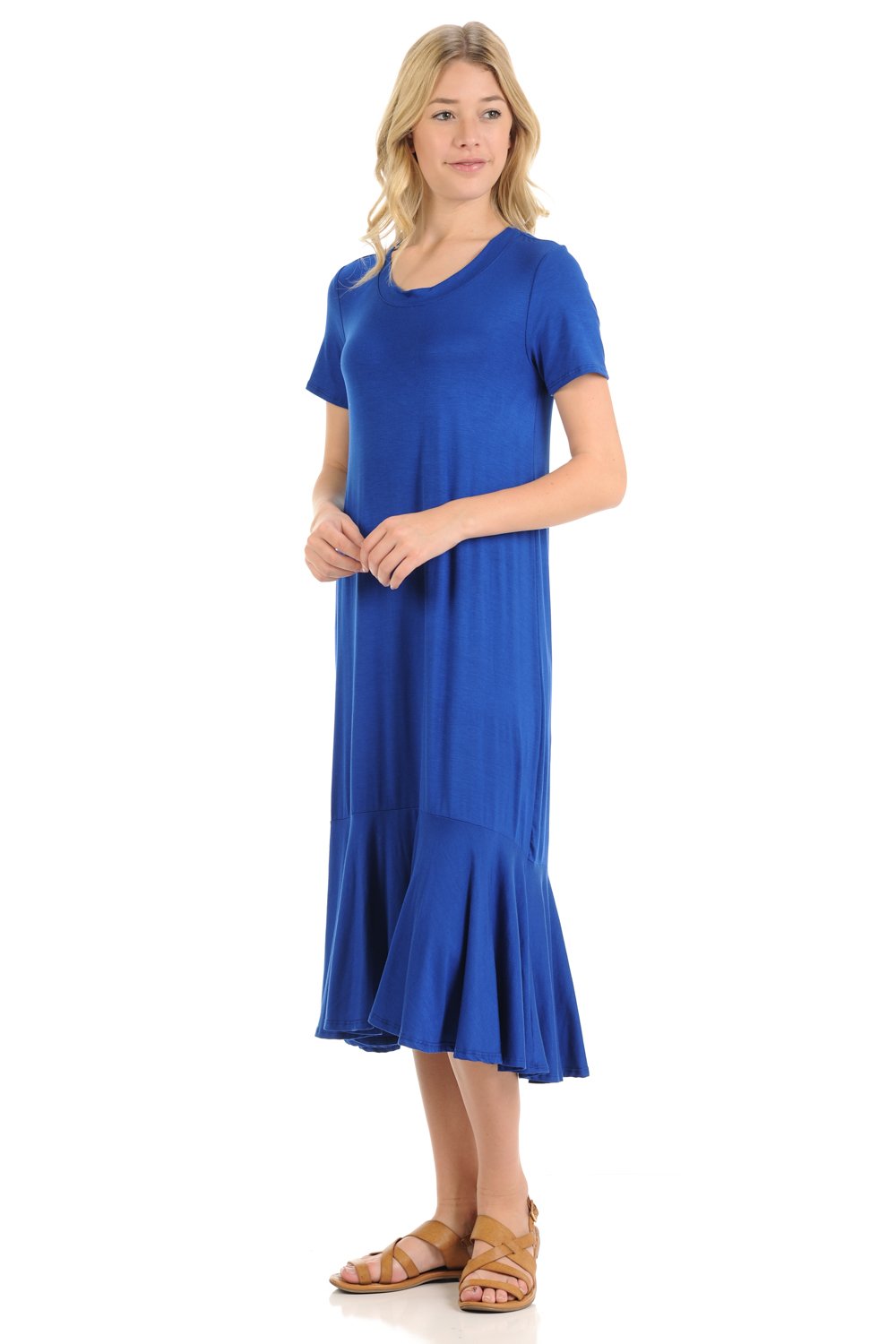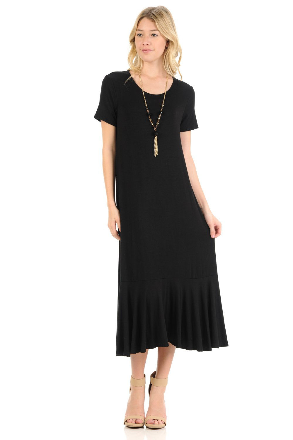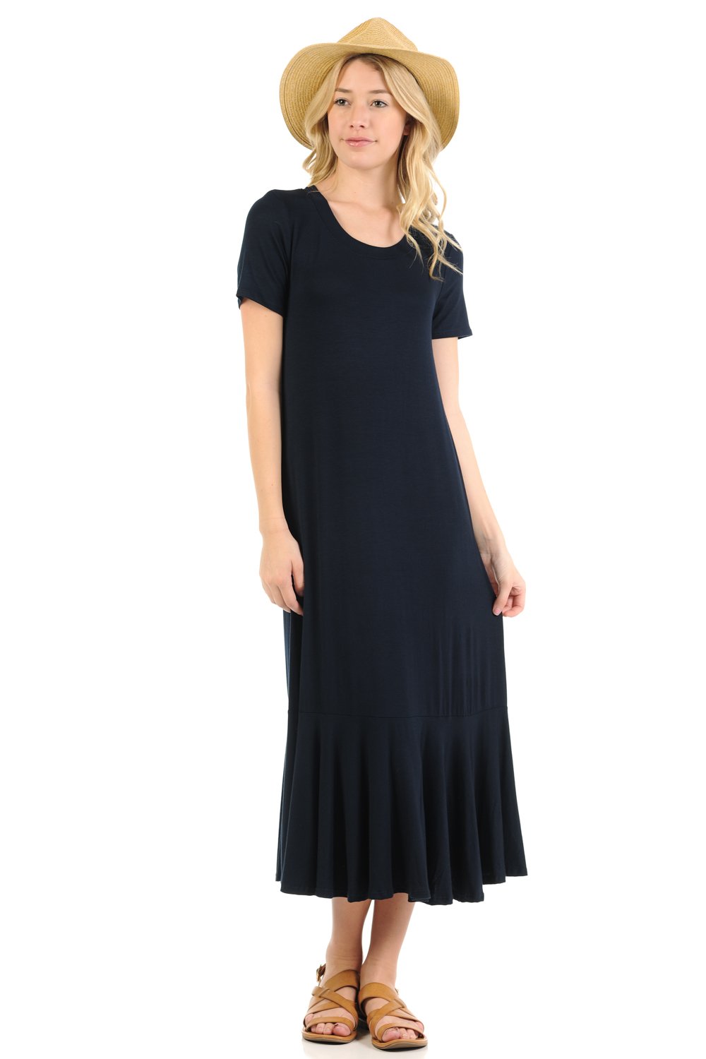 - This carefree dress features short sleeves, round neck, figure flattering A-line silhouette and ruffle hemline. It is made of soft jersey knit that has great drape.