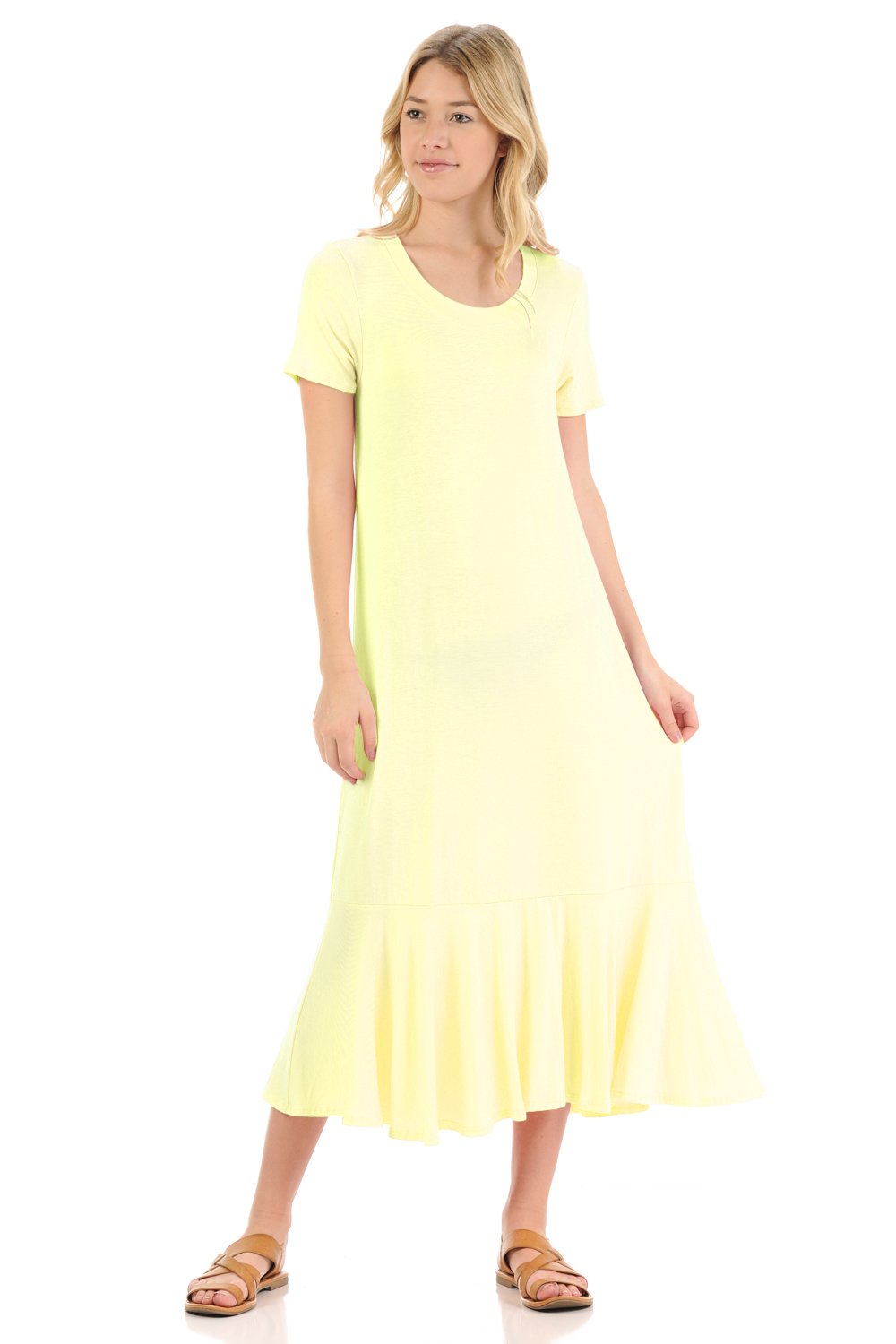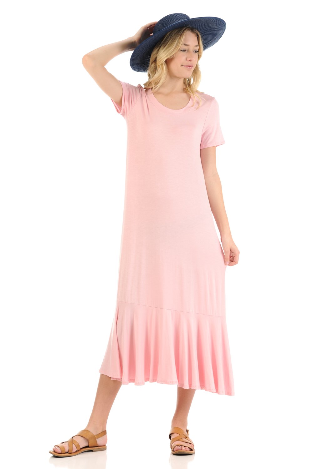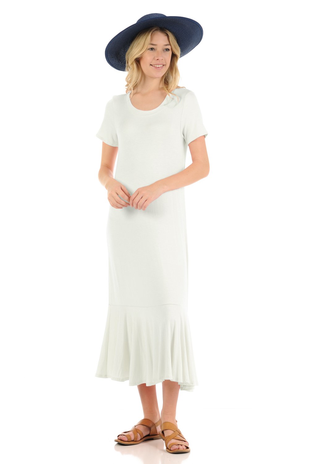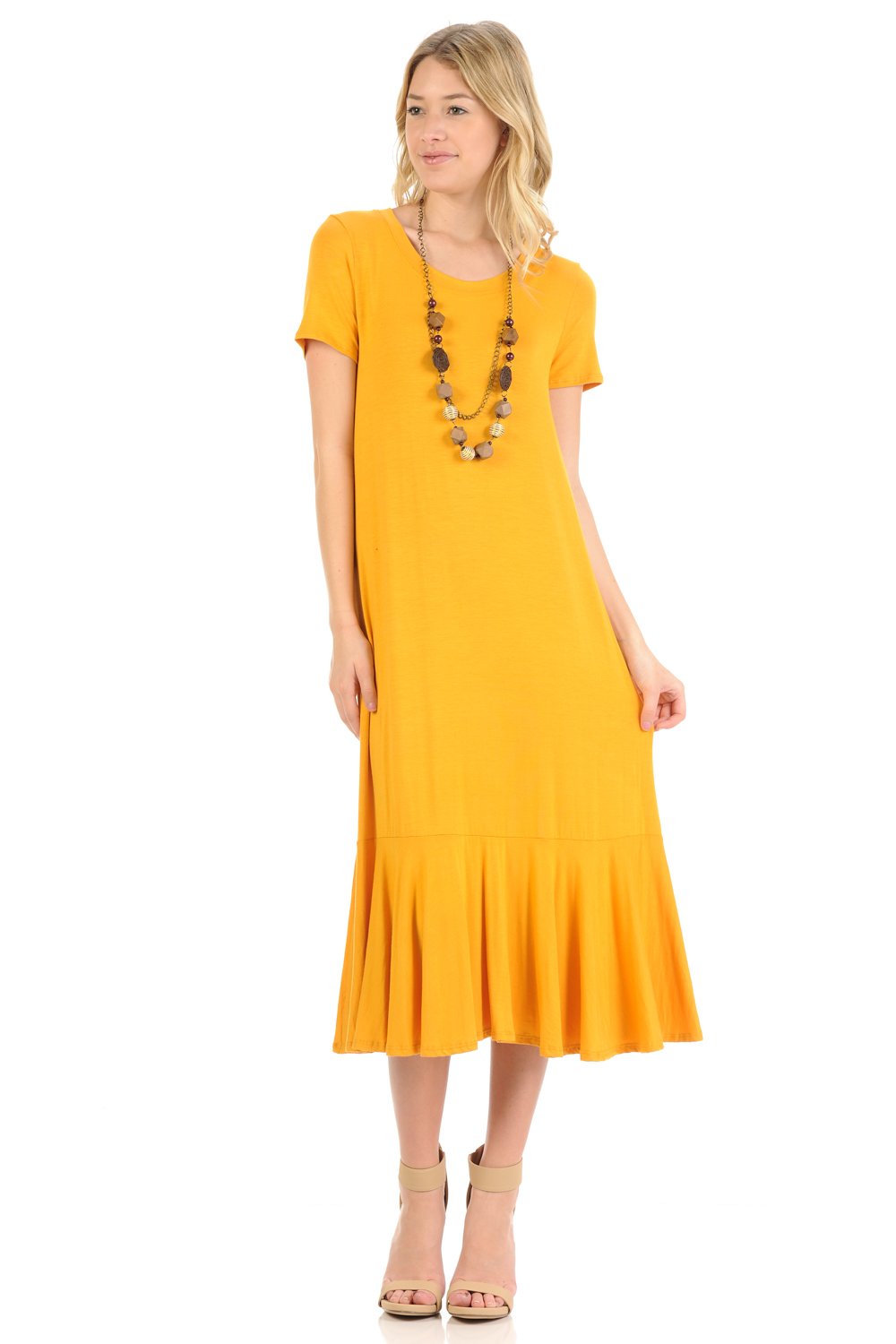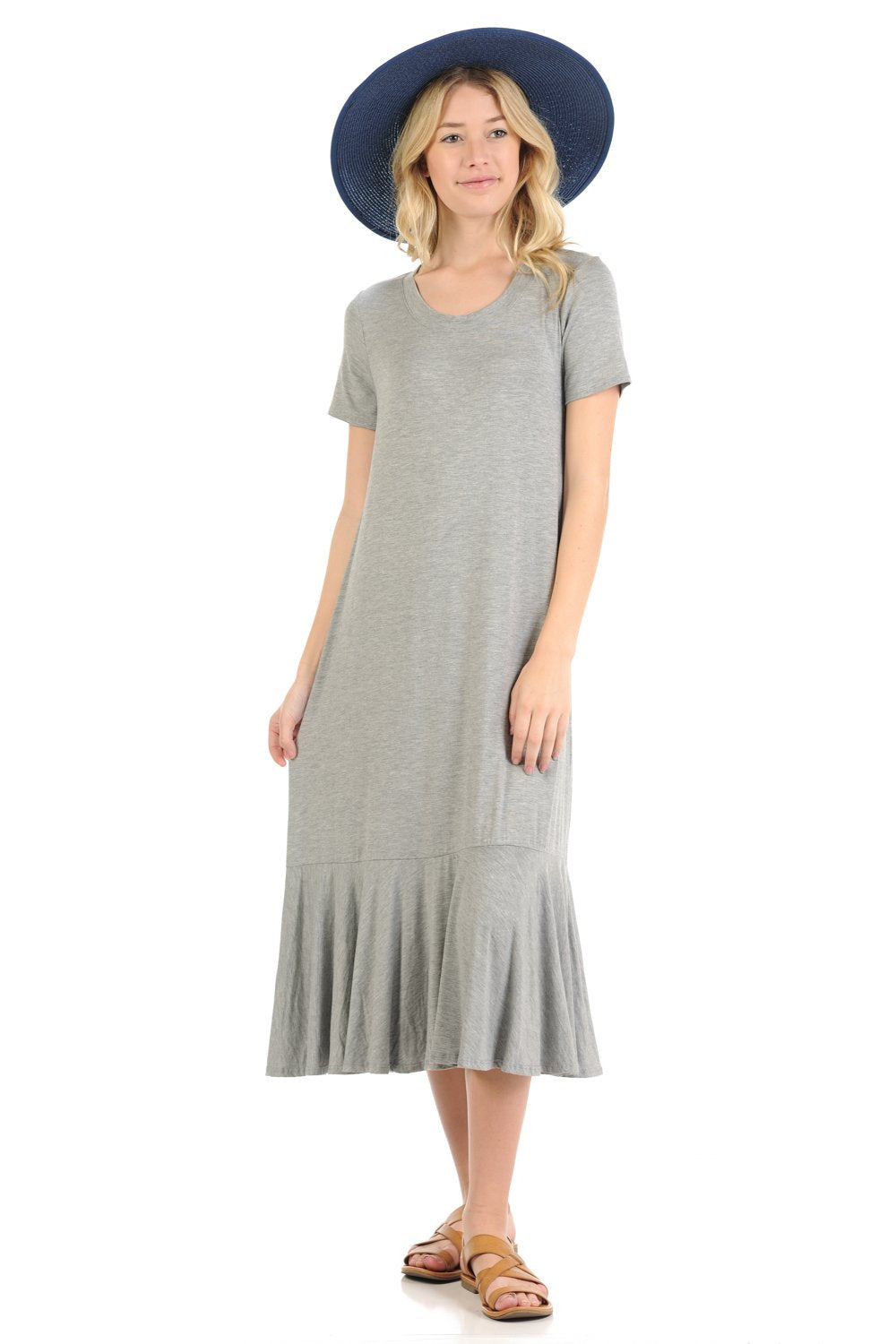 - This carefree dress features short sleeves, round neck, figure flattering A-line silhouette and ruffle hemline. It is made of soft jersey knit that has great drape.
