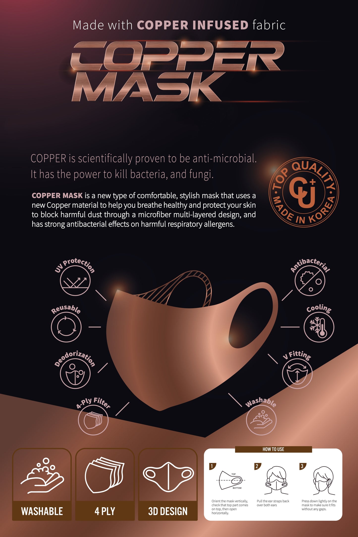 Anti-Bacterial Copper infused mask prevents the penetration of bacteria caused by droplet infection. Four layer filter fabric to have a safer bacteria protection and ergonomic 3D design for all day long comfort.