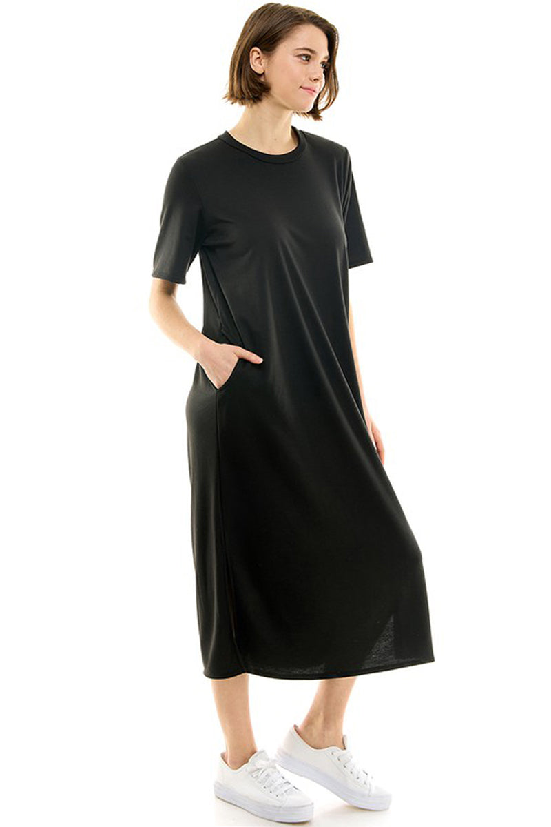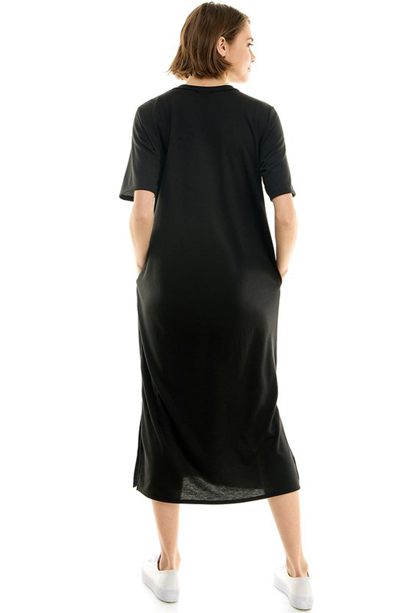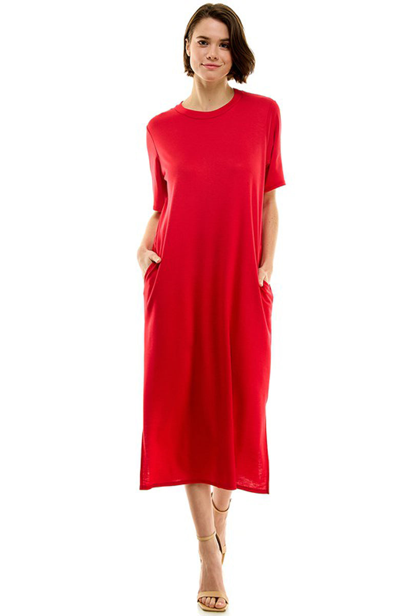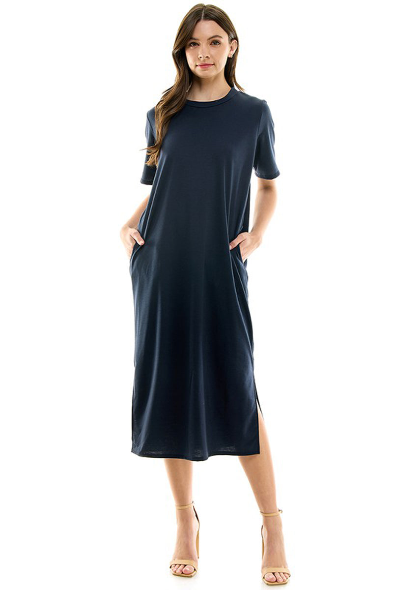 - Features: banded round neckline, half sleeves, concealed side pockets, side slits, midi length