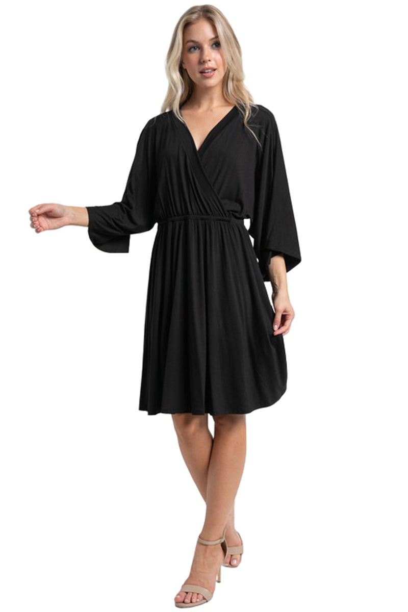 - Dress features V-neckline, kimono three-quarter sleeves, elastic waist, wrap front, flare skirt, pullover style and stretchy fabric.