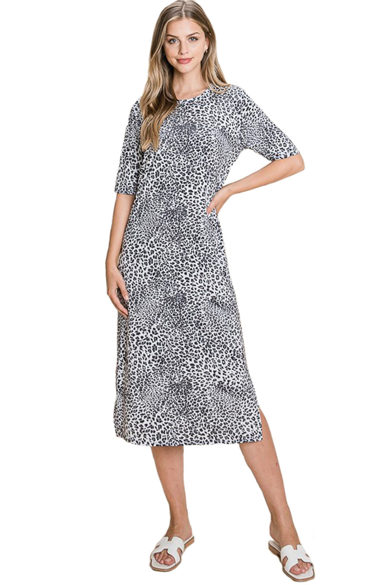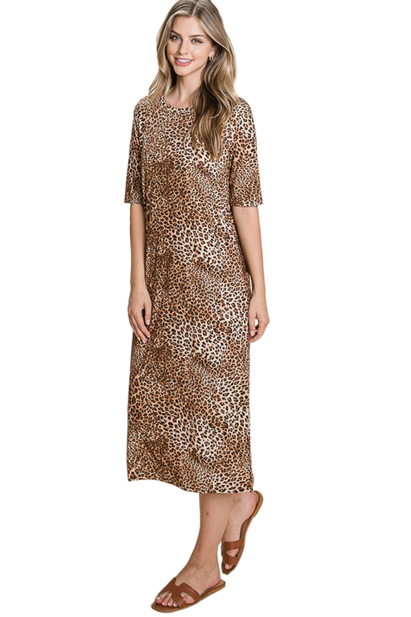 Elevate your everyday look with this Leopard Print Midi Dress from Iconic Luxe. A casual fit allows for lovely drape over the figure, along with a slit at the side that adds a touch of chic detail and extra freedom of movement.
