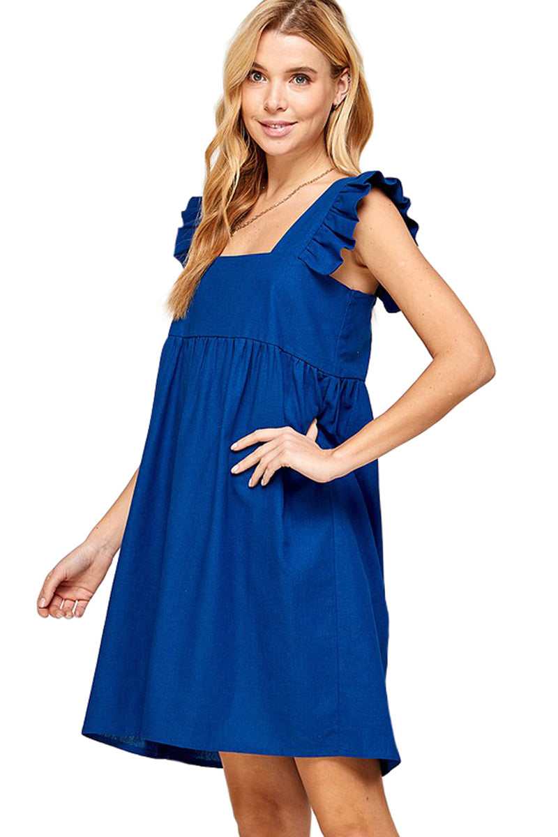 - Dress features ruffle detail on stick straps, shirring along waistline, square neckline, baby-doll silhouette, pullover style and linen fabric.