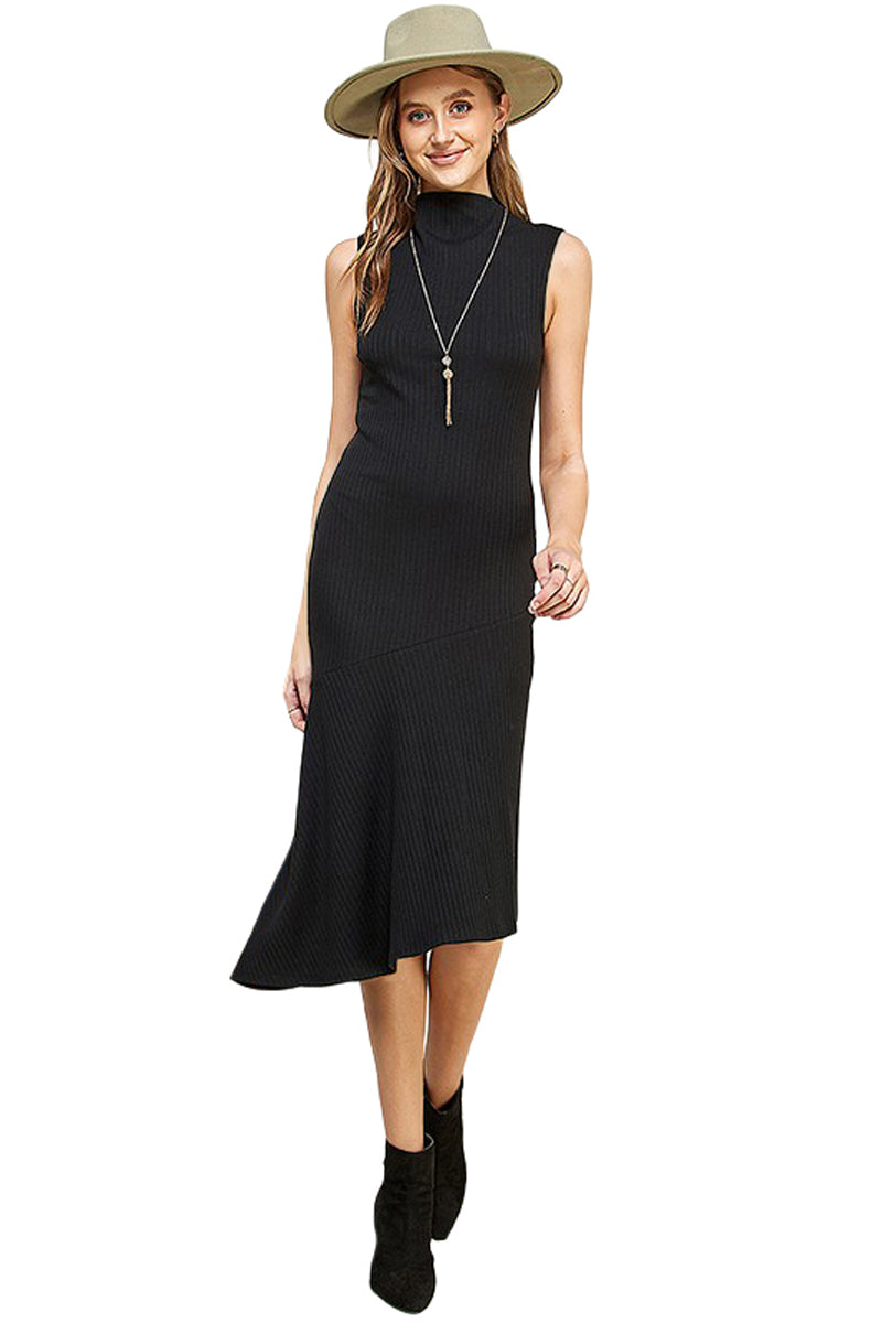 - Features: mock neckline, sleeveless style, asymmetric ruffle hemline, midi length