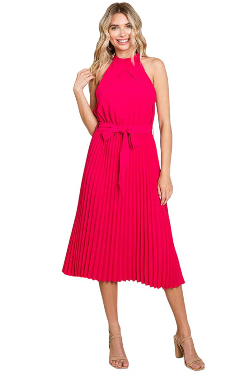 The Pleated Self Tie Waist Halter Dress from Iconic Luxe is a stylish and feminine option that combines a flattering silhouette with eye-catching pleated details and a cinched waist for a sophisticated and fashionable look. It can be dressed up with heels and accessories for formal events like weddings or cocktail parties. Alternatively, it can be paired with flats or sandals for a more casual and relaxed look, suitable for daytime outings or summer gatherings.