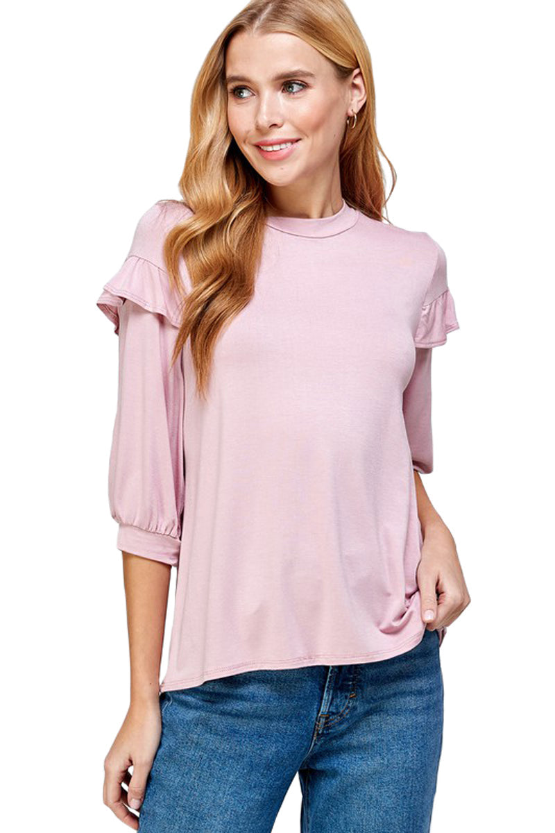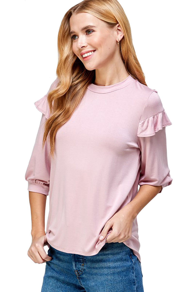 This three-quarter top makes a go-to staple in your basics wardrobe. It features a crew neckline and ruffle detailing on the shoulder for a lovely look. The top is made from soft, stretchy fabric for cool comfort, and it has a pullover design for easy wear.