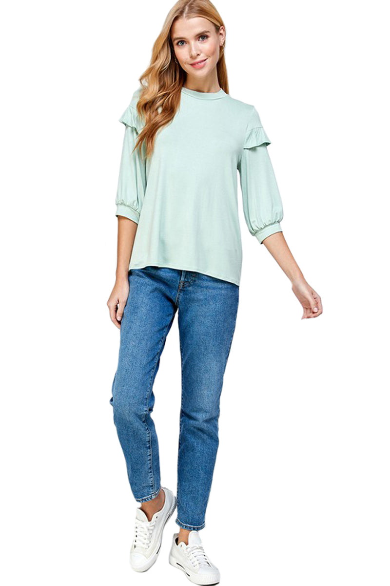 - Top features banded crew neckline and three-quarter sleeves with cuffs and ruffle detail on shoulders.