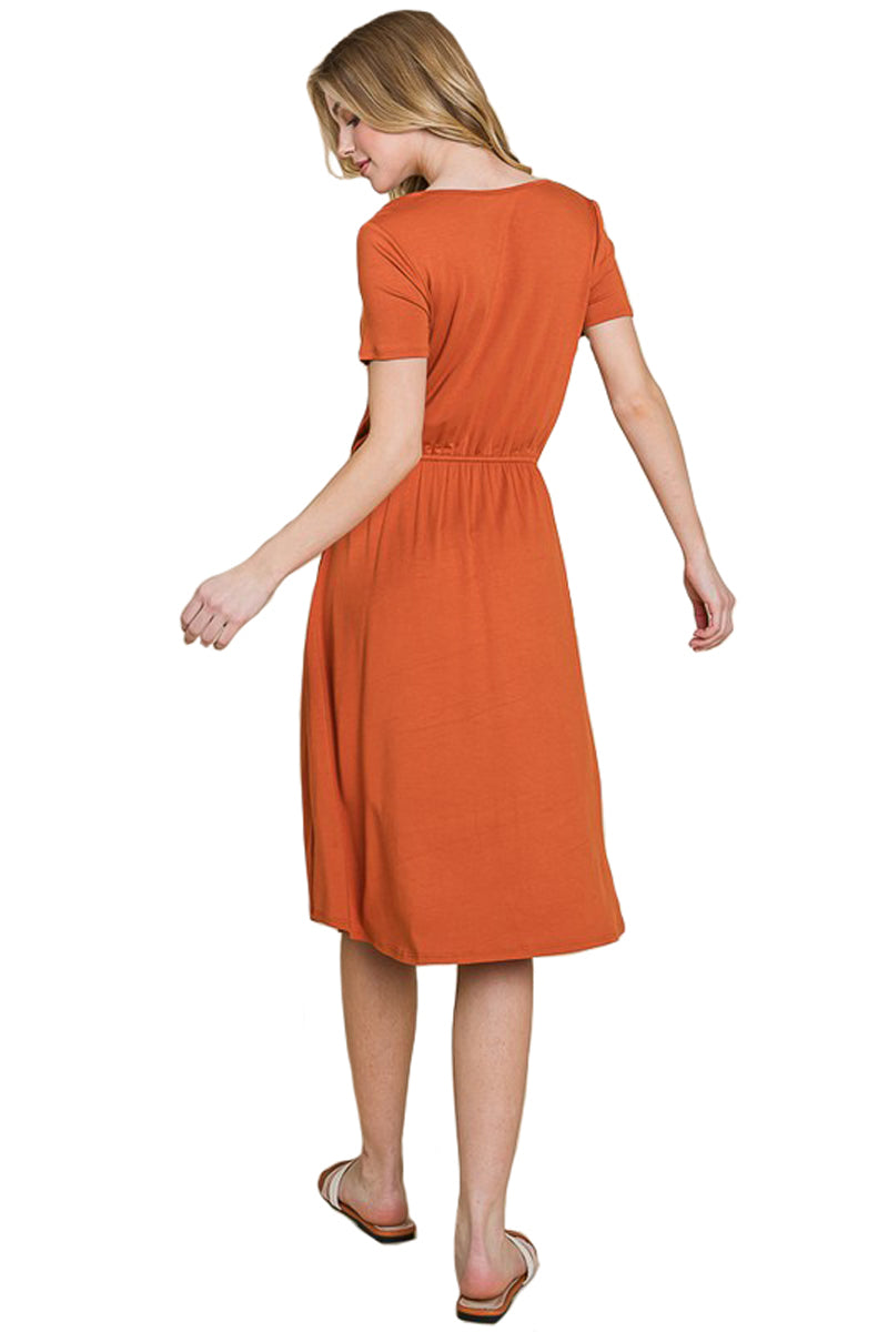 - Features: rounded neckline, short sleeves, side pockets, drawstring waist, midi length, round hemline