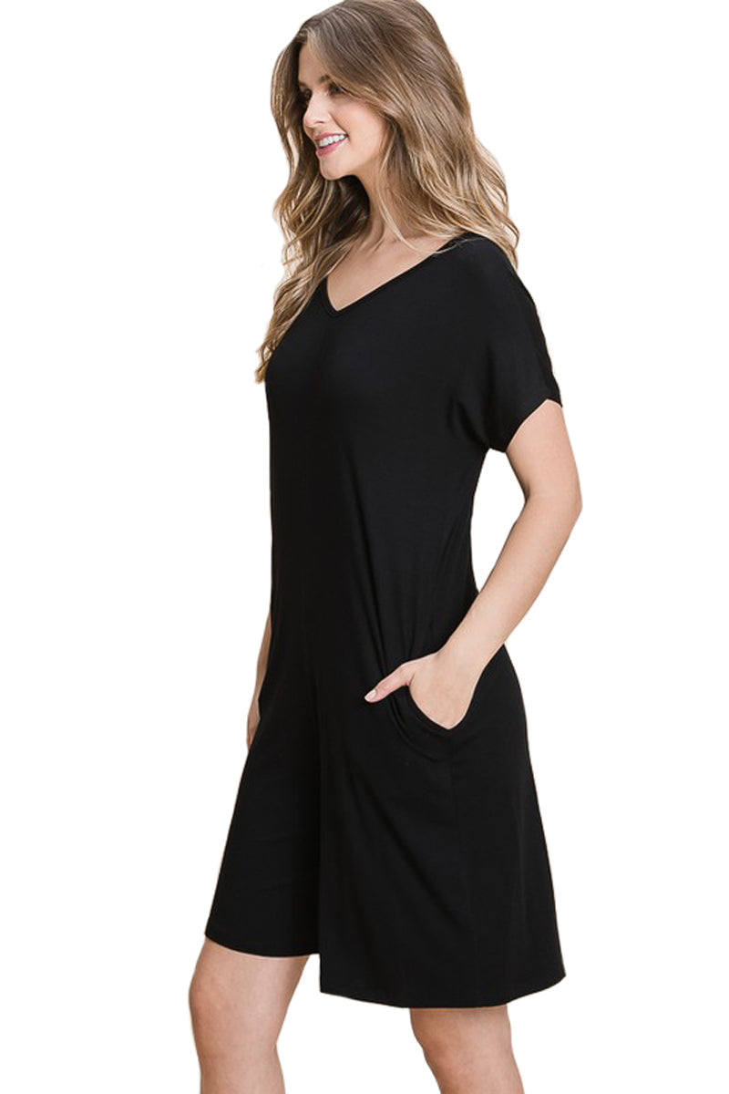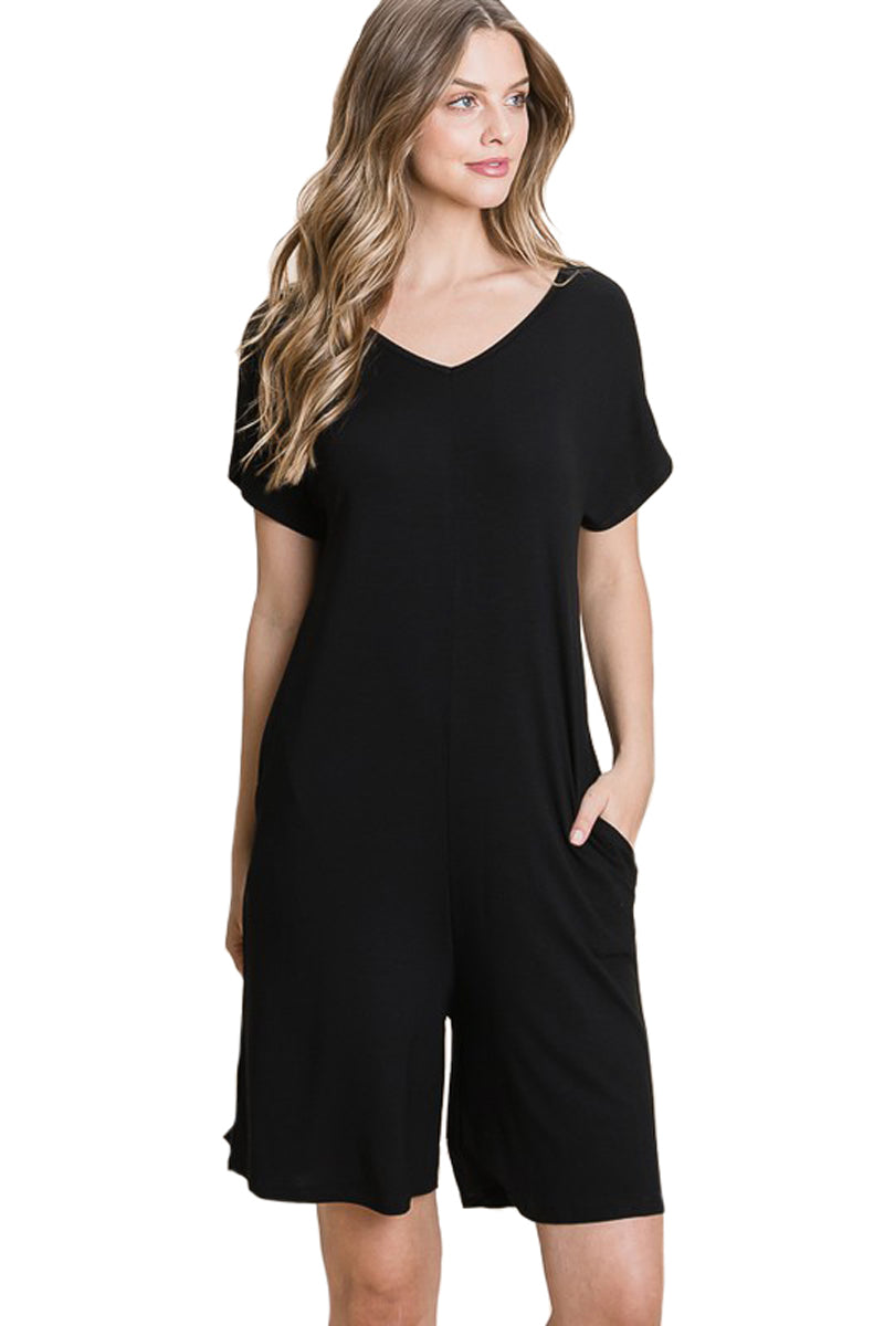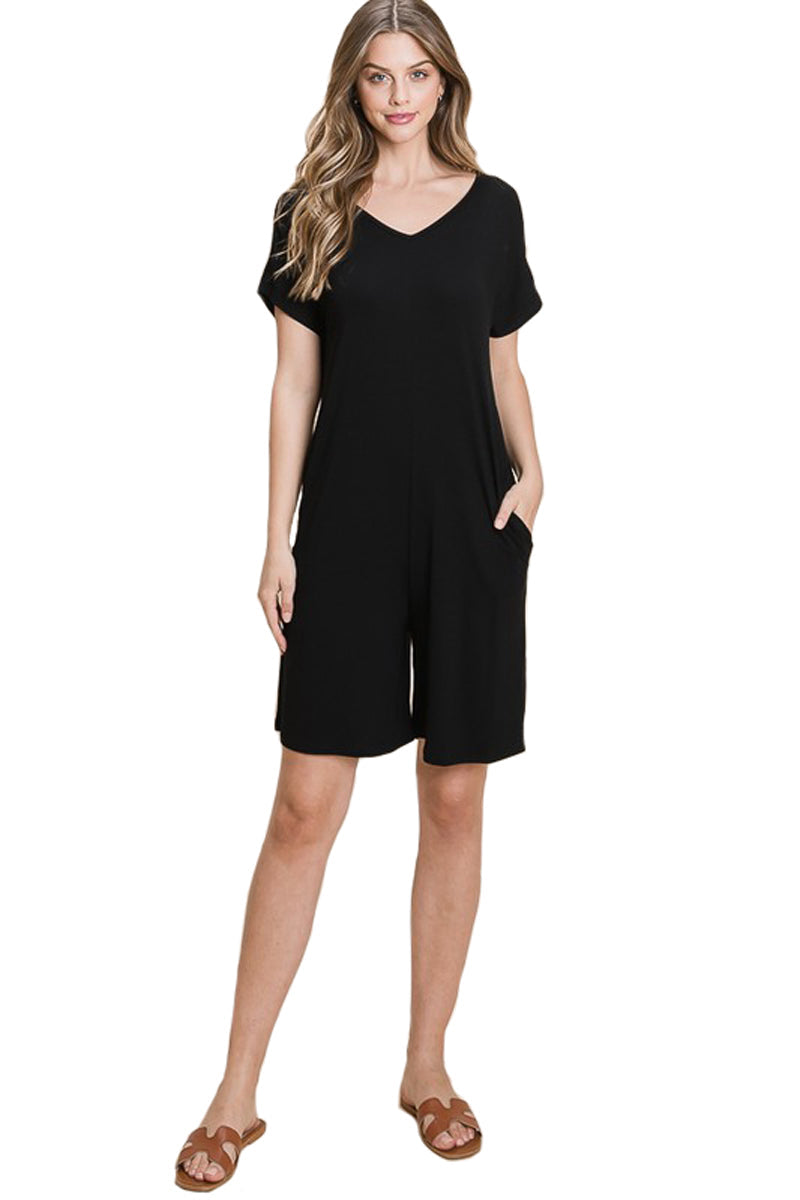 - Romper features V-neckline, short sleeves, dropped shoulders, shorts and concealed side pockets.