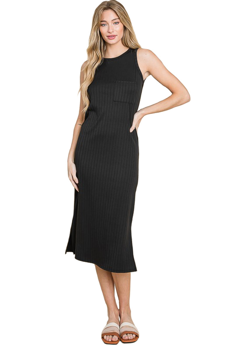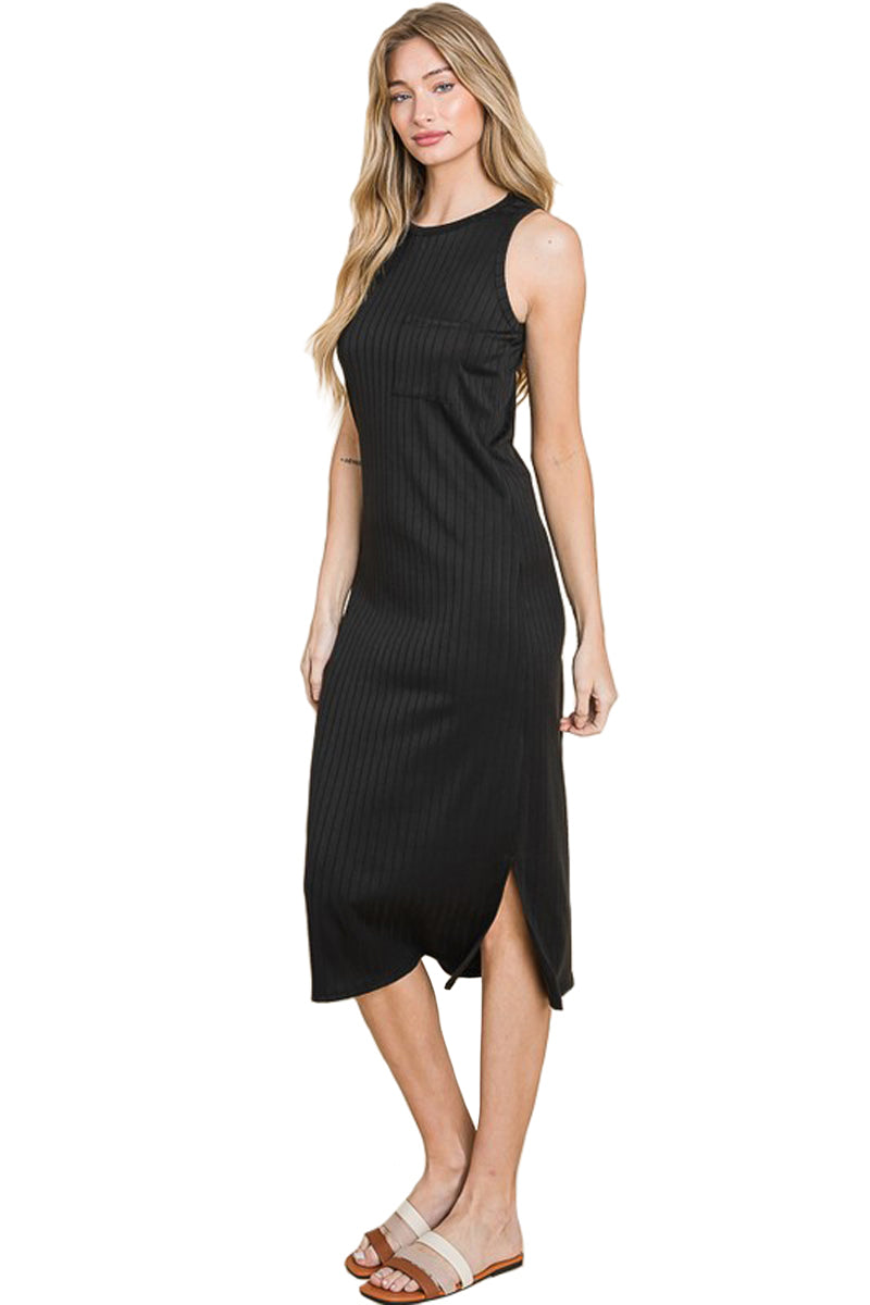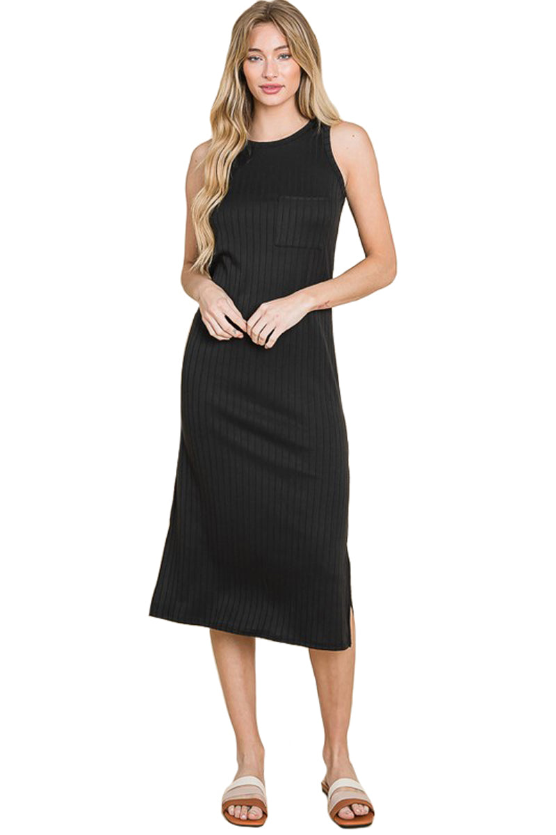 Freshen up your wardrobe options with the addition of this Sleeveless Rib Knit Dress with Patched Pocket from Iconic Luxe. Its midi length and side slits give it a chic, feminine style perfect for creating new date night looks or laid-back fits for casual outings with the girls. It's super easy to pair with your favorite shoes and accessories for a variety of different outfits.