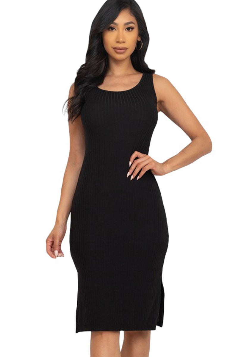 - Features: rounded neckline, sleeveless style, bodycon silhouette, midi length, side slits, ribbed fabric