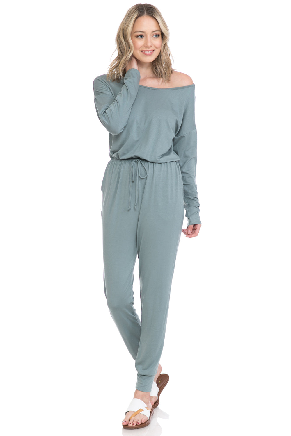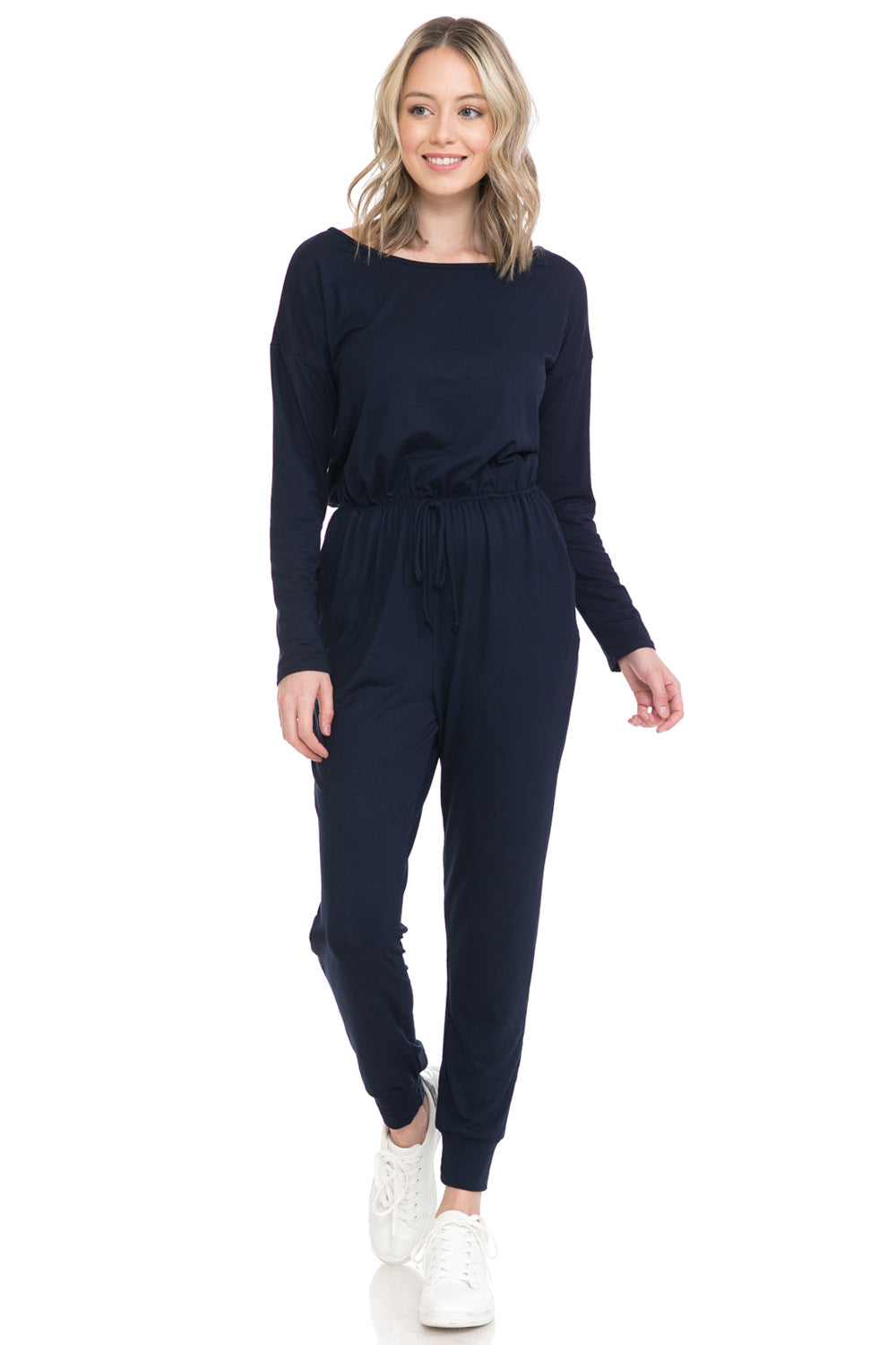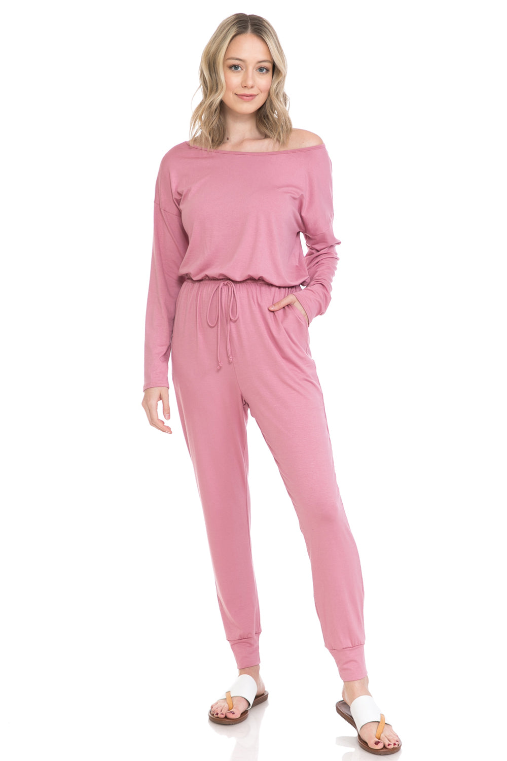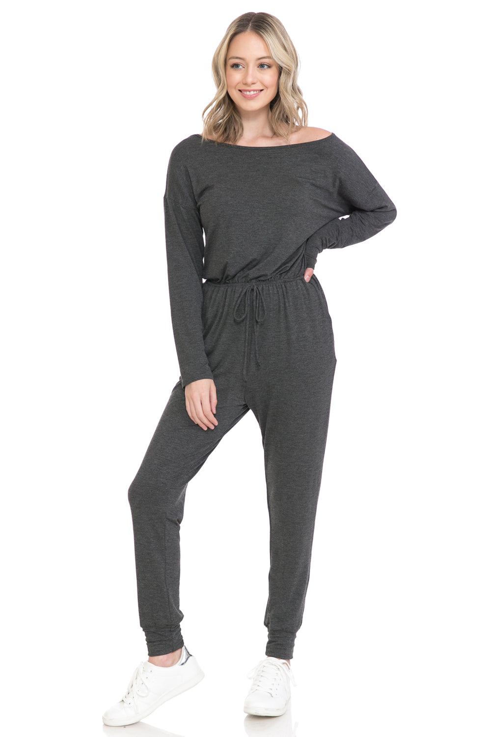 Jumpsuit features boat neckline, long sleeves, elastic waist, tie detail, concealed side pockets and cuffed legs. It can be worn off shoulder.
