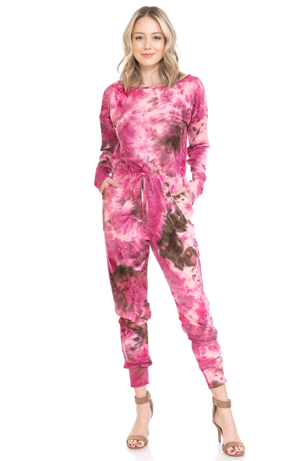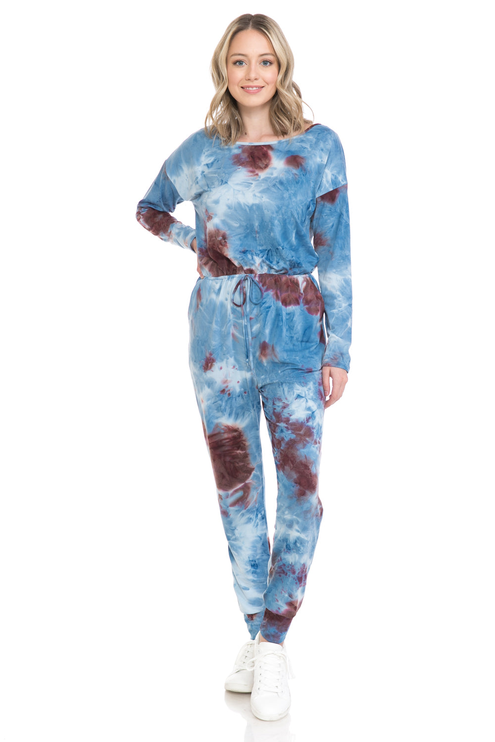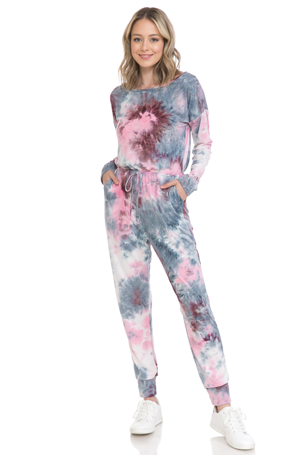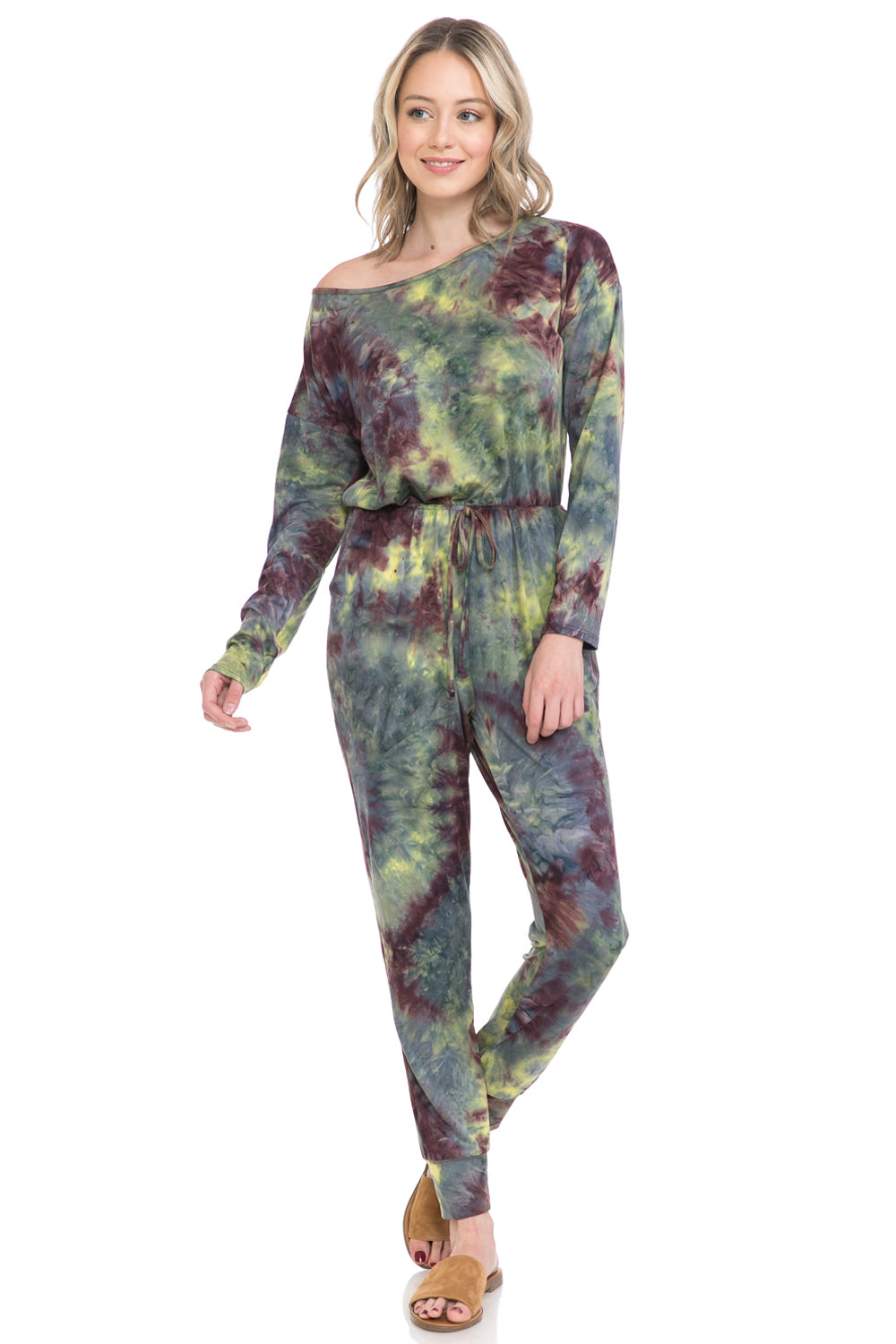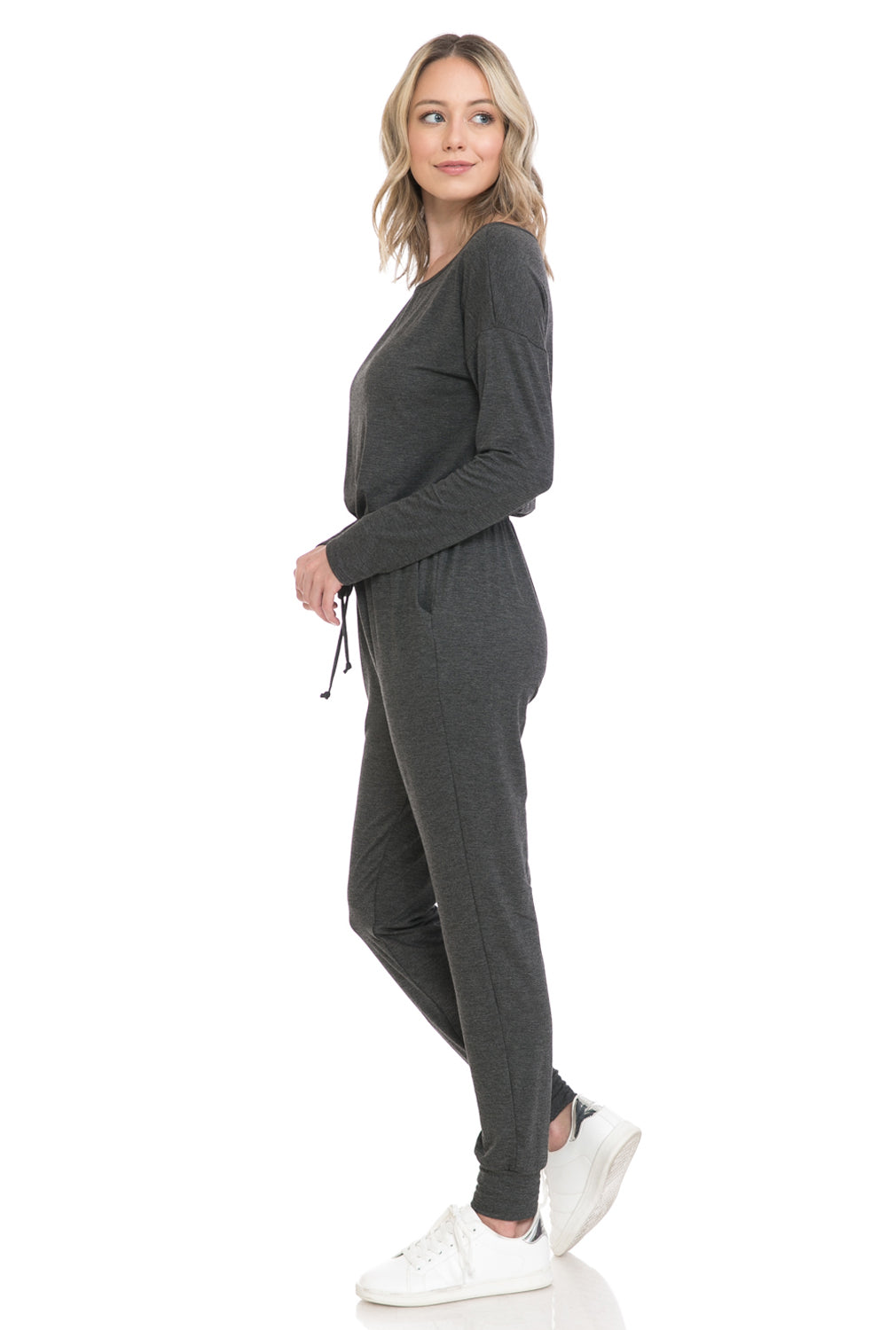 Jumpsuit features boat neckline, long sleeves, elastic waist, tie detail, concealed side pockets and cuffed legs. It can be worn off shoulder.