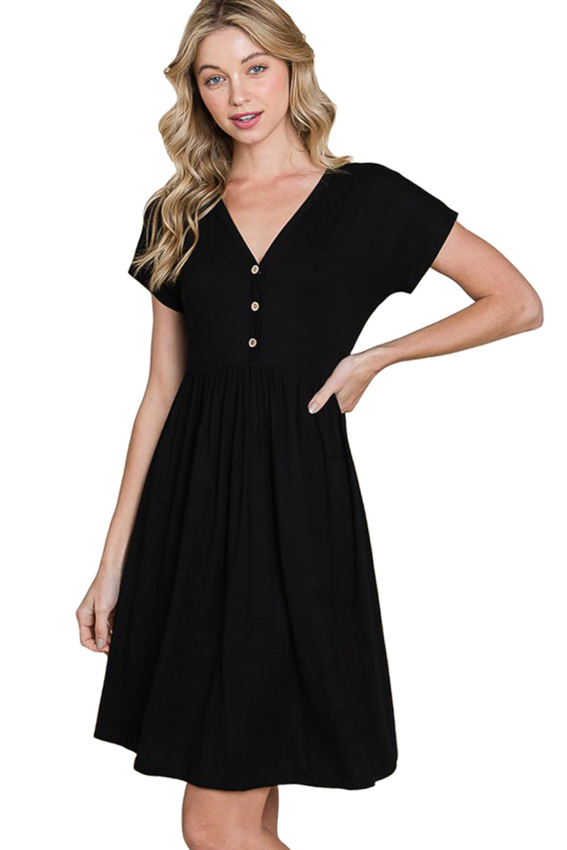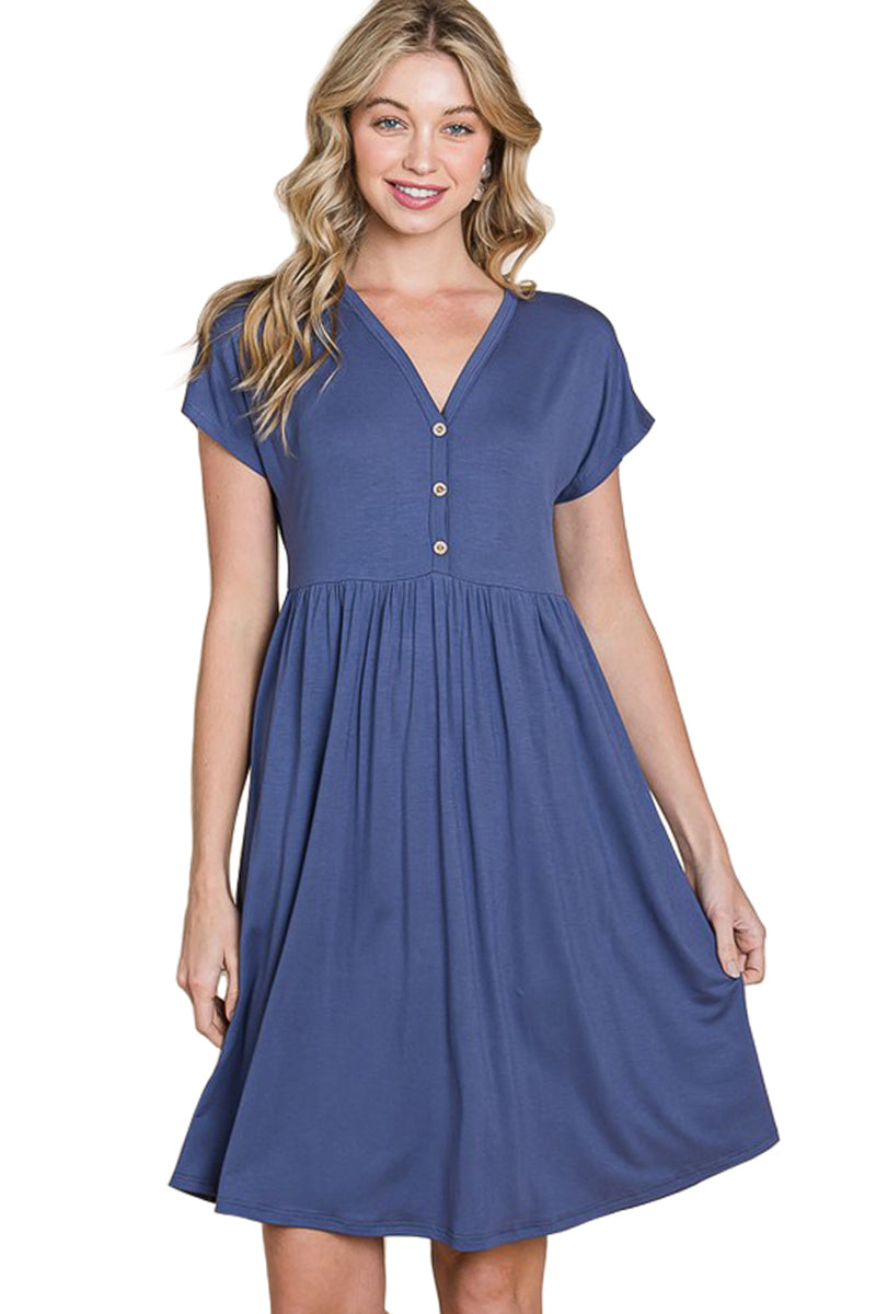 - Dress features V-neckline, short sleeves, dropped shoulders, soft fabric, faux button detail, baby-doll silhouette and pull over style.