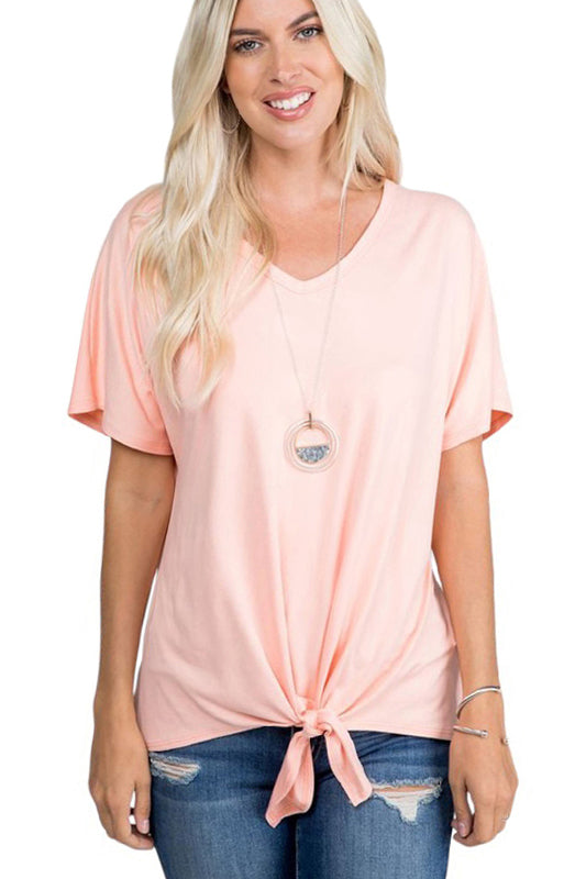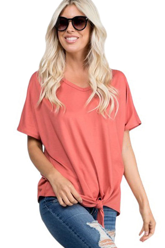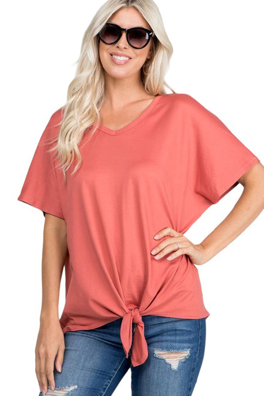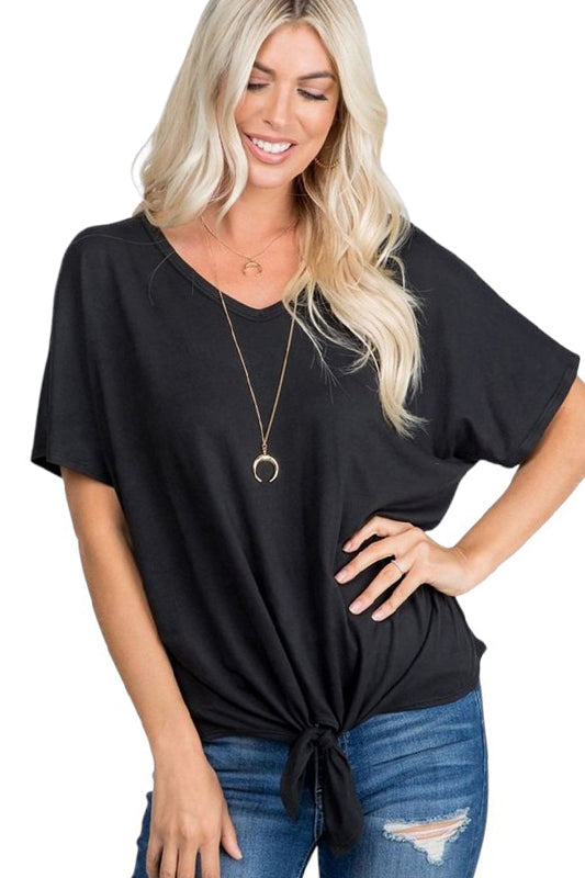 - Features: V-neckline, short dolman sleeves, high-low hemline, front tie detail
